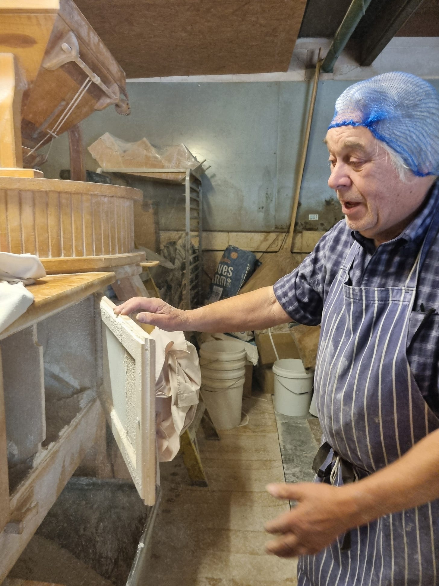 I see the beautiful wooden mills in action, and smell the grains and the fresh flour, a million miles away from most of the flour we see in supermarkets. Syd is proud to be one of the few bakers in the UK still milling their own flour.